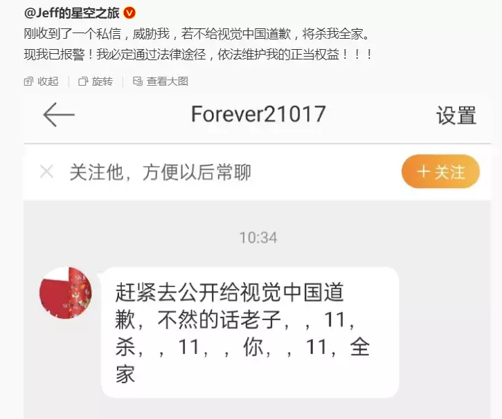 金融界8月18日消息 与视觉中国深陷版权争论的知名摄影师戴建峰刚刚发声!他表示,“刚收到了一个私信,威胁我,若不给视觉中国道歉,将杀我全家。”他表示已经报警,将通过法律途径依法维护自己的正当权益。