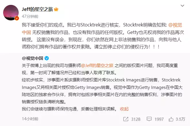 当晚,版权图片网站“视觉中国”官方微博公开回应此事回应称,经初步核实,涉事图片系该摄影师授权图片库Stocktrek Images进行销售,Stocktrek Images又将相关图片授权给Getty Images销售。