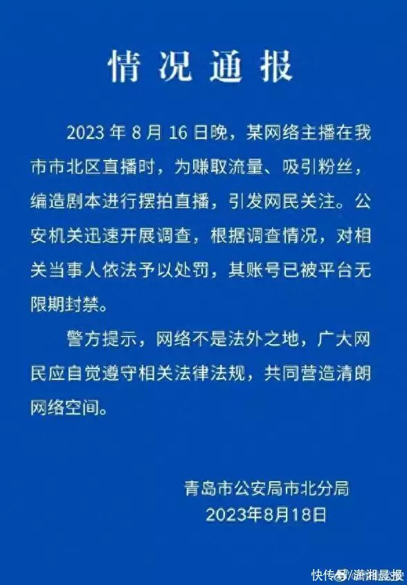 近日,网曝主播“二驴”在山东青岛户外直播途中被绑架殴打,事件引发关注青岛警方8月18日通报:2023年8月16日晚,某网络主播在青岛市市北区直播时,为赚取流量、吸引粉丝,编造剧本进行摆拍直播,引发网民关注。
