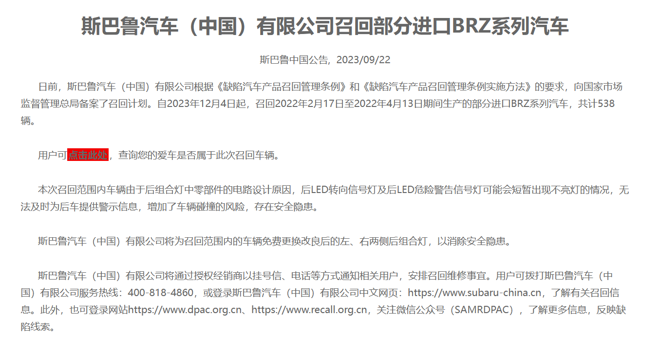 召回 2022 年 2 月 17 日至 2022 年 4 月 13 日期间生产的部分进口 BRZ 系列汽车,共计 538 辆IT之家附查询链接,可查看车辆是否在召回范围本次召回范围内车辆由于后组合灯中零部件的电路设计原因,。