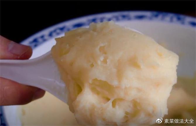 2.在篦子里太难操作,咱们把它放在大碗里,用勺子压成比较细腻的土豆泥,看看现在捣好了,特别的细腻。