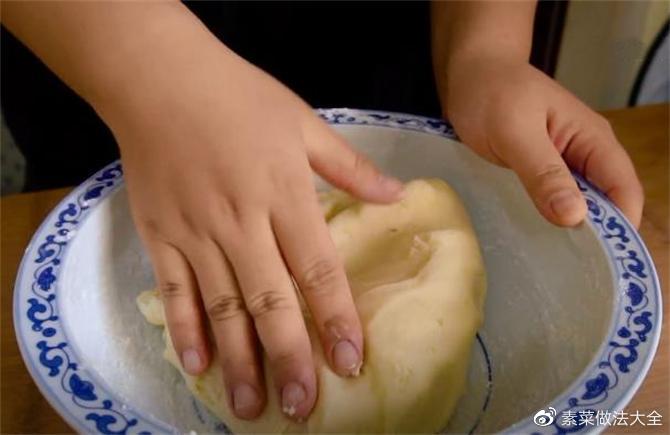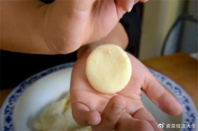 4.直接揪一小块面剂出来,在掌心团圆,手掌向下按压成一个小圆饼。