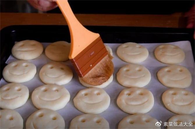 5.都做好之后,咱们拿根筷子,先戳两个眼睛,再拿一个勺子出来,压出一个笑脸,都做好了之后,在表面刷一些油。