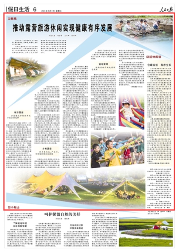 《人民日报》 2023年05月03日 第 06 版 版面截图 原标题: 推动露营旅游休闲实现健康有序发展 蓝天白云下,青山绿水间,支一顶帐篷,邀亲朋好友,听蝉鸣,闻清风,话家常,好不惬意 近年来,露营成为广受人们欢迎的假日休闲方式。