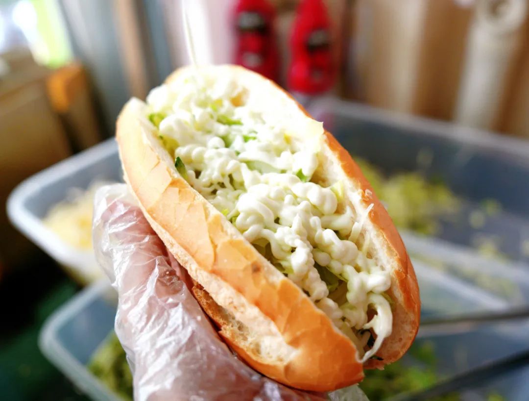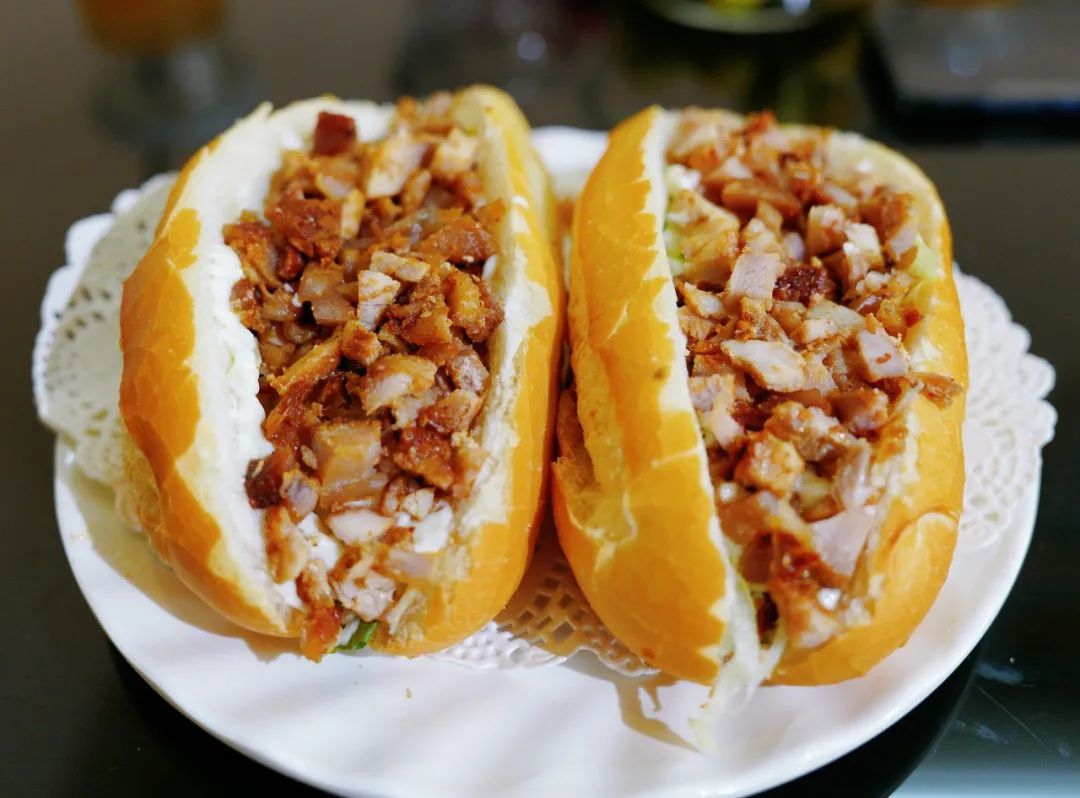 将面包从中间切开,然后塞满秘制肉片、新鲜木瓜丝、生菜、香菜等,再淋上沙拉汁,最后放入小烤炉烘烤至外表金黄。
