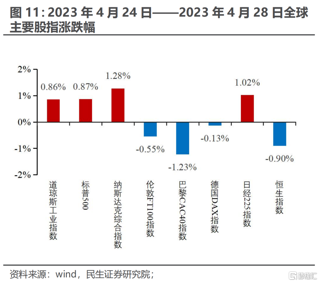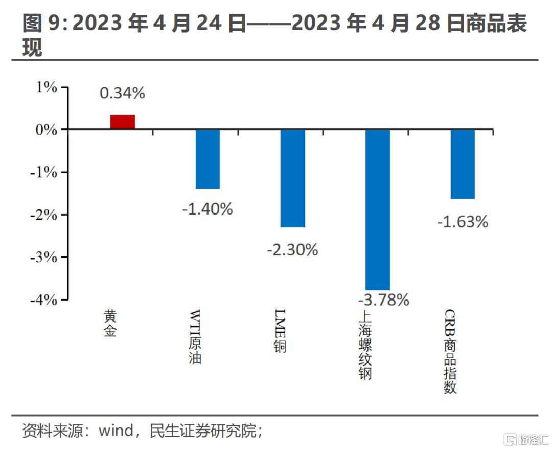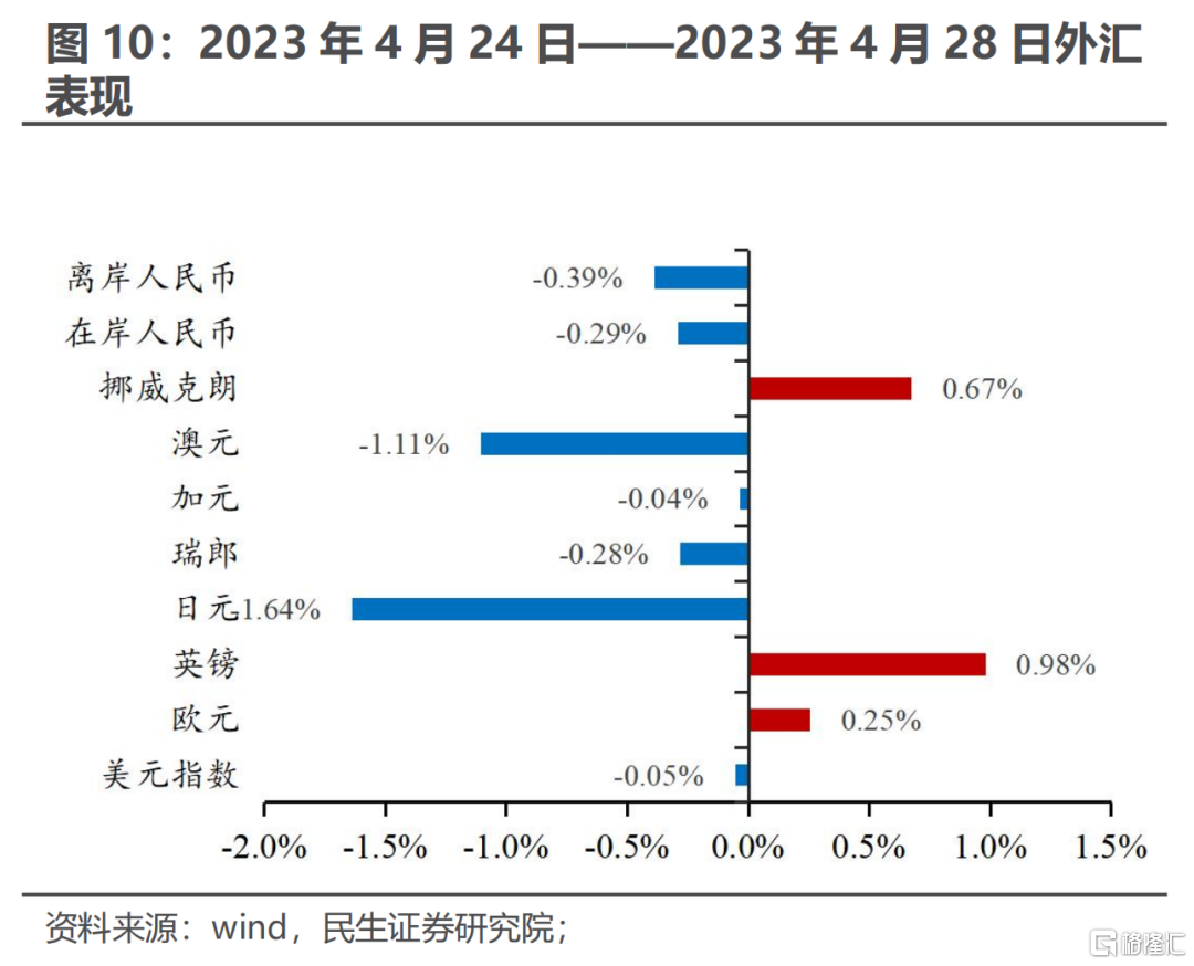 本周美元指数走弱,欧元、英镑走强;人民币受经济基本面、地缘政治等因素有所贬值;日本央行4月货币政策会议上维持货币政策不变,日元快速走弱未来关注:美联储5月FOMC会议、美国4月非农数据周四(5.4)将迎来美联储FOMC会议,根据美联储3月会议点阵图指引,本次联储或将如期加息25个基点,当前市场核心关注点在于本次会议联储是否确认停止加息。