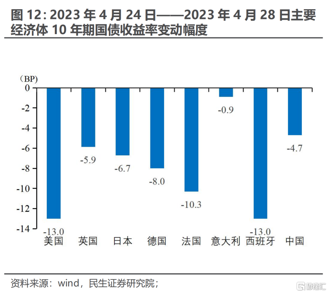 国债收益率全线下行,信用债涨跌不一城投、房地产、商业银行债、二资本债等与国债利差的利差波动不大海外市场:美国一季度增速不及市场预期,海外债券普遍走强美国一季度GDP增速年化环比上升1.1%,较2022年第四季度的2.6%放慢了1.5个百分点,远低于市场此前预期的2%。