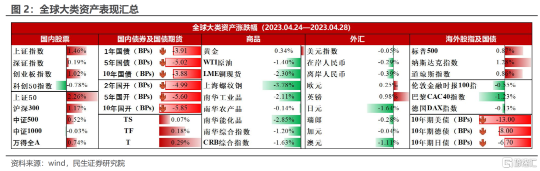 股票市场整体延续“高热度、快轮动”,资金在TMT板块和其他板块中快速轮动宽松的资金面加持下,本周债券市场表现较好海外市场对衰退担忧有所加剧美国一季度GDP增速不及预期,原油、铜等大宗商品明显走弱,黄金、债券等走强,海外股票市场也涨跌不一。