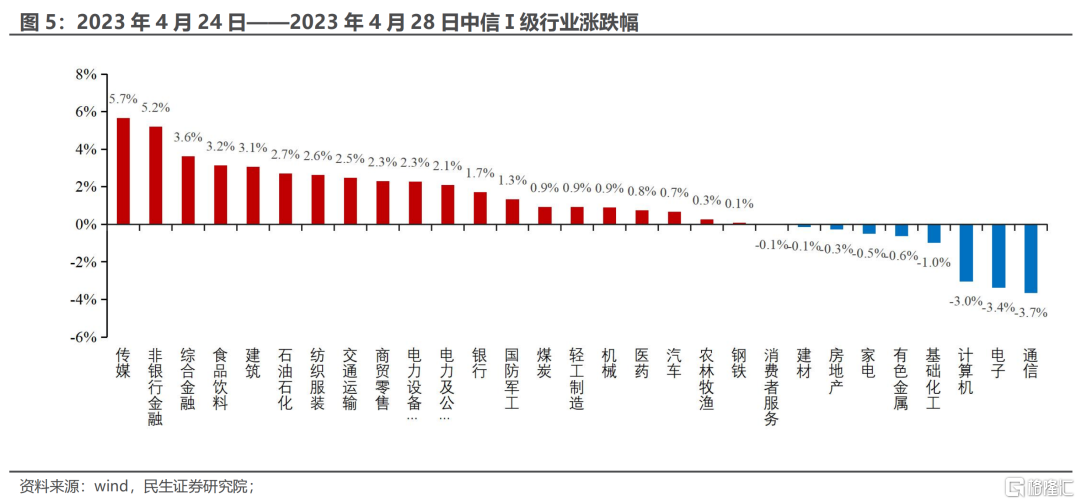 市场预期保险产品利率或有调整,将提升保险盈利空间,同时一季度保费收入增长良好,保险板块迎来上涨,带动价值板块跑赢成长行业方面,传媒、非银等领涨;计算机、电子、通信等回调行业方面,大部分板块有所上涨,其中传媒、非银、综合金融、食品饮料、建筑等行业涨幅较大;通信、电子、计算机、基础化工、有色金属等跌幅靠前。