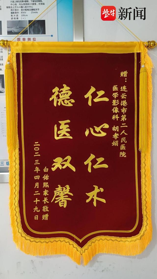 送来感谢锦旗 4月29日晚上,五一小长假的第一天,医学影像科的胡孝娟值夜班她提前半小时来到科室接班的时候,发现窗口有位10岁左右的孩子一直在哭,边上的家长(白先生)急得满头大汗,一问才知道孩子不小心摔了一下,胳膊当即就剧烈疼痛、无法活动,很有可能发生了骨折。