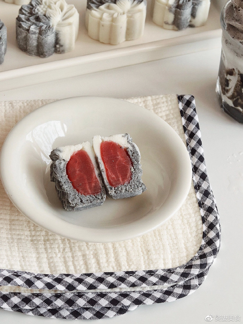 接着,取出适量的白色和黑色面团,各30克左右将两个面团分别揉圆,再将黑色面团压扁后包入适量的红酒馅将包好馅的黑色面团放入白色面团中心,然后将白色面团揉圆这样,就形成了一个外层白色,内部黑白相间的球形面团。