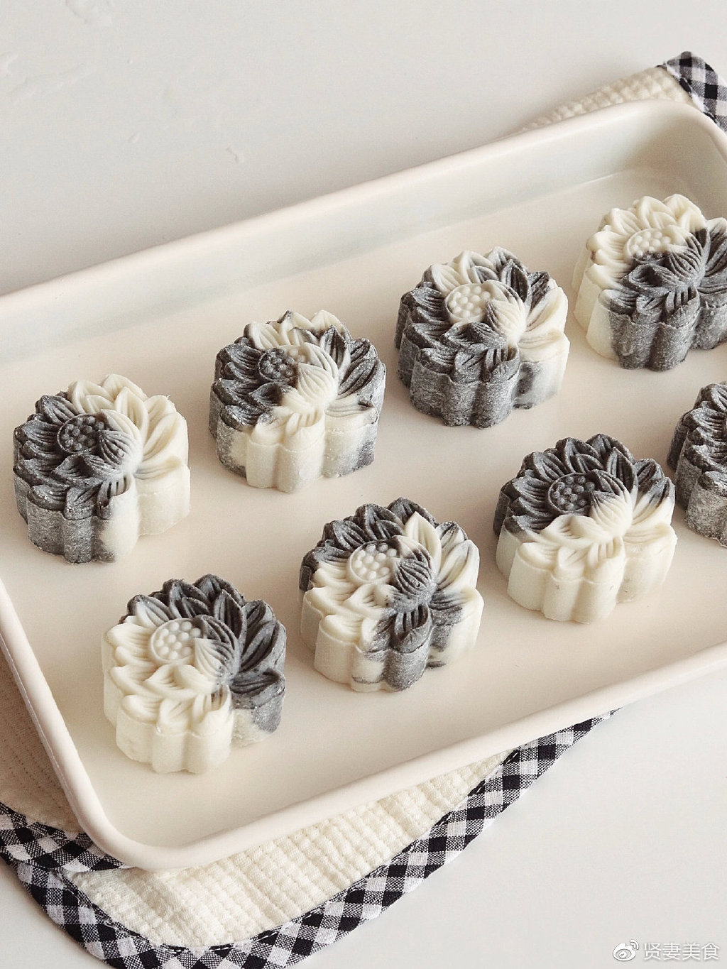 然后,将熟糯米粉倒入山药泥中,揉成一个均匀的面团将面团分成两份,其中一份加入黑芝麻粉揉匀这一步是为了赋予山药糕不同的颜色和层次感