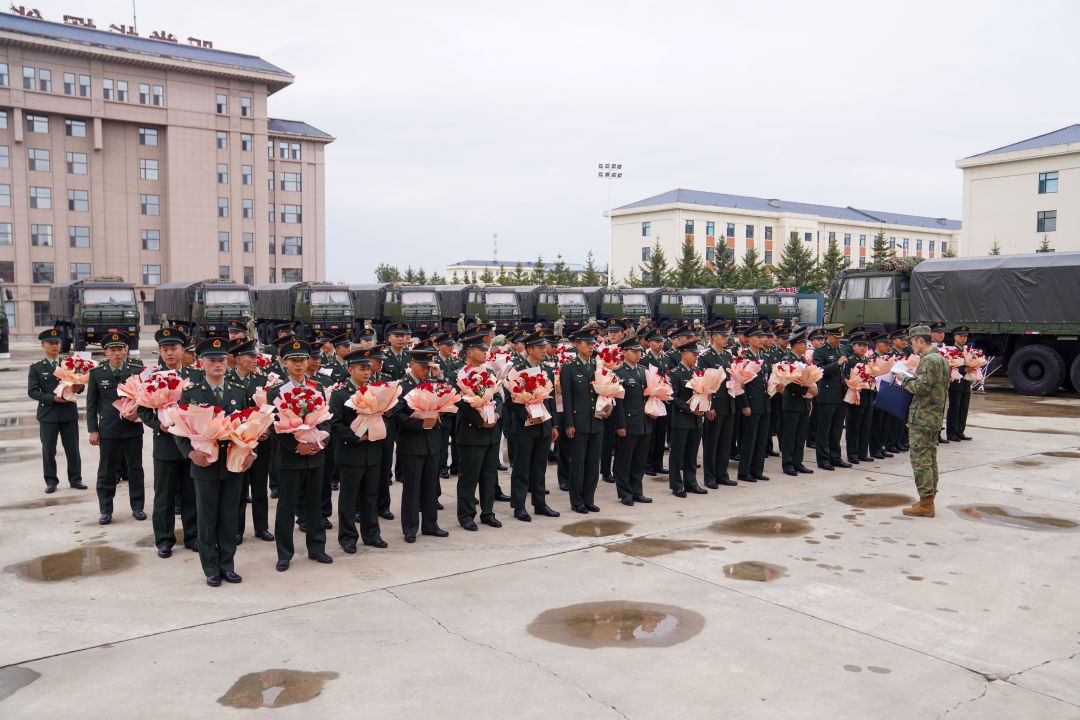 搭载着女青年的巴士缓缓驶来兵哥哥们手持鲜花列队迎接