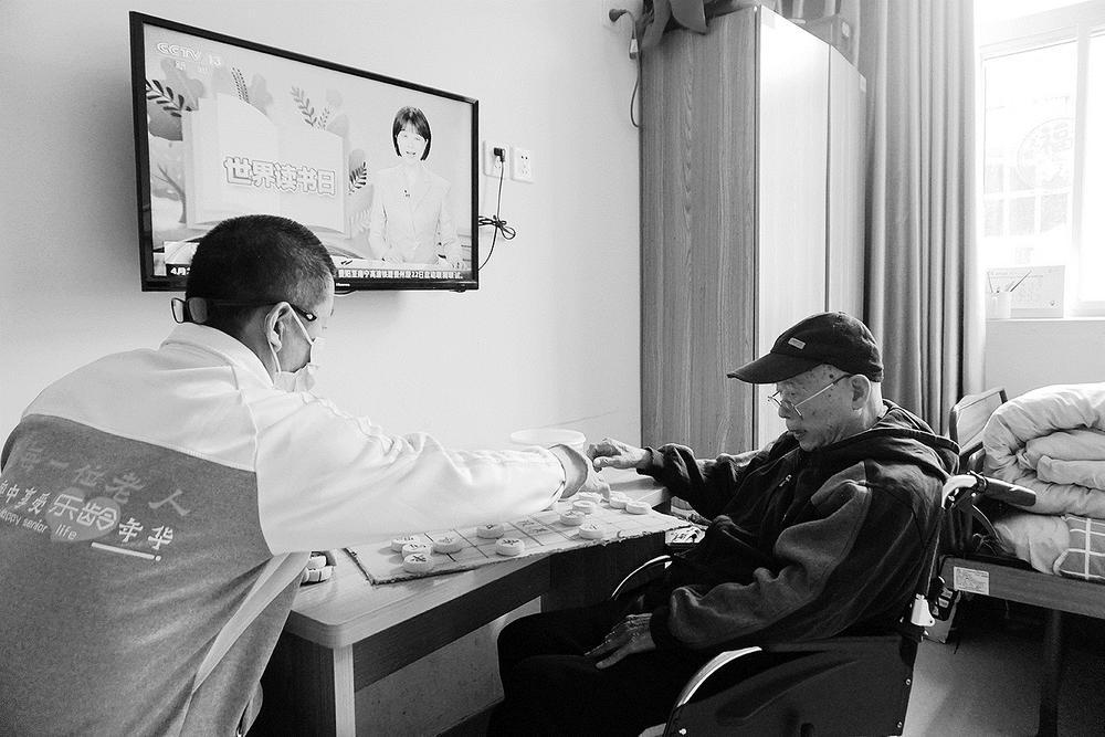 护理员陪老人下象棋 在前期调研摸排辖区居民需求和涉老服务资源情况后,北京市石景山区广宁街道养老服务联合体日前正式启动“养联体”40家成员单位将立足自身服务优势,为老年人提供理发、修脚、中医理疗、法律咨询、义诊等公益服务。