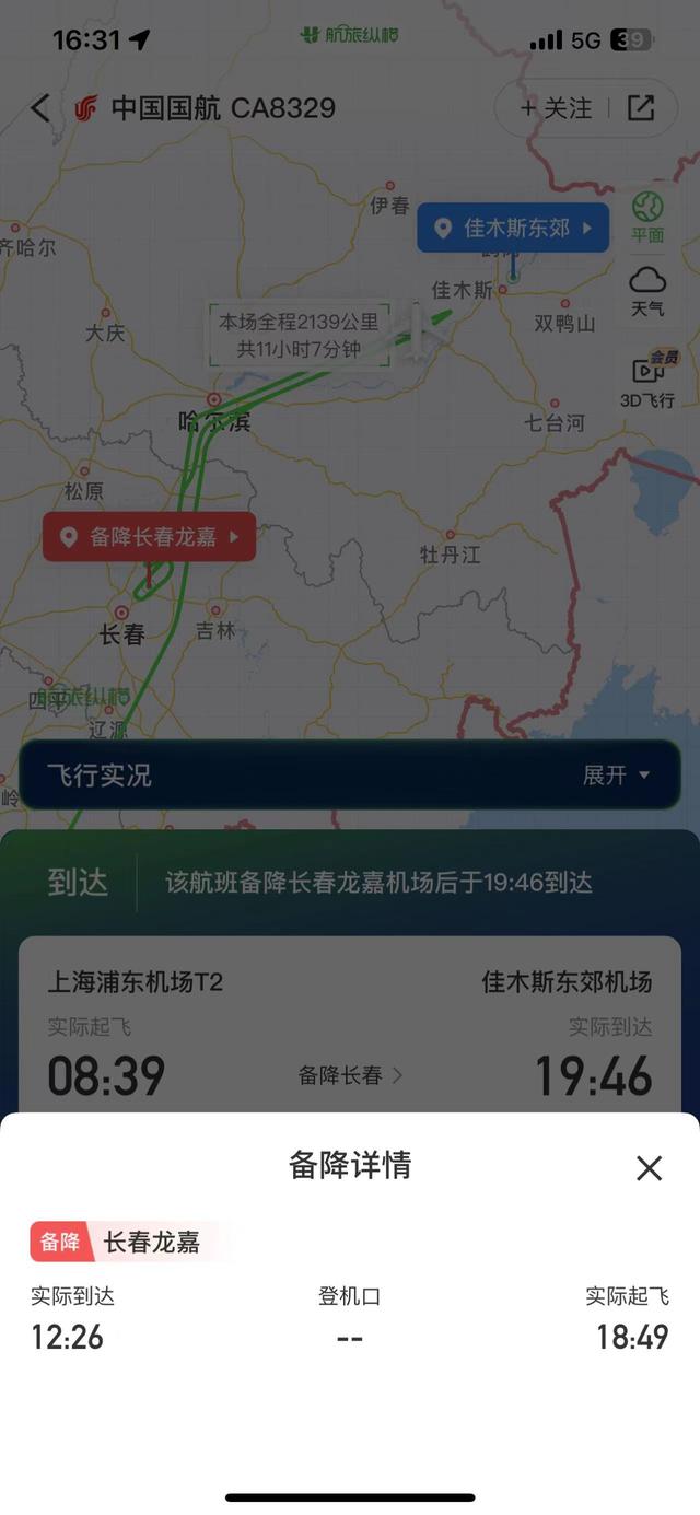 2月28日,两人乘坐的CA8329班机因机场原因备降长春