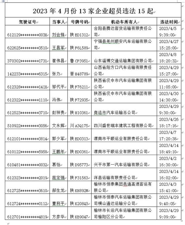 4月份,全省共查处高速公路超速50%以上违法180起,涉及本省车辆106起;高速公路倒车8起,涉及本省车辆7起;高速公路逆行1起,为本省车辆全省共查处超员违法30起,其中15起涉及13家企业单位陕西省汉中市汽车运输集团有限公司2起,渭南市平顺运业有限责任公司2起,其余11家企业单位各1起。
