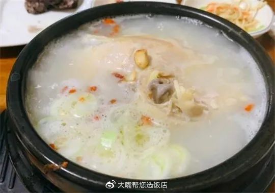 店不大,烤肉、炒菜、年糕锅都有,品种相当全了他家的参鸡汤,在很多人的心目中那可是排名第一的光参鸡汤有7种,基础款的参鸡汤选用童子鸡,鸡肚子里面包裹着糯米,汤的味道很正,应该是熬制时间比较长的效果,糯米吸饱了汤汁,更是软糯鲜甜,鸡肉紧致有弹性,鸡汤温暖滋补。