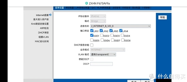 光猫既然可以当作路由器使用,而且可以配置vlan,绑定端口,那我完全可以把光猫设置更改一下啊!删掉所有VLAN连接,重新建立一个Internet连接,模式选择桥接 ,绑定网口1其他不用选,配置上网的VLAN,关闭DHCP,保存,这样就可以通过软路由进行拨号了。