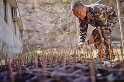 雾灵山自然保护区管理处,马志红在珍稀濒危植物实验繁育苗圃查看植物的生长情况 斑羚粪是圆的,狍子粪是长的;野猪会把落叶拱成一条线,分散的坑则是猪獾的杰作……提到雾灵山林场里的动物们,马志红总是有说不完的话。