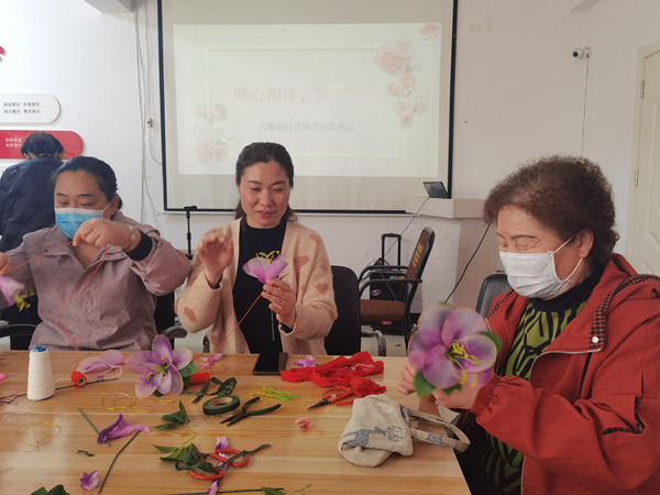 为了让辖区老年人老有所乐,丰富他们的精神文化生活,近日,在铜沛街道民馨园社区新时代文明实践站内,社区志愿者张桂霞正在向老年人现场演示丝网花的制作方法今年以来,铜沛街道依托各社区新时代文明实践站广泛开展“巧手生花”“指尖上的艺术”等文娱活动70余次,通过各类文娱活动,为社区老年人提供了相互学习和交流的平台,真正实现了老有所学、老有所乐。