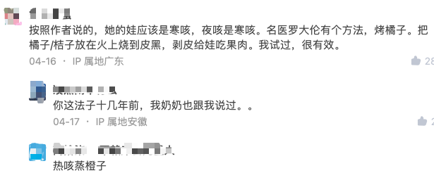 网友:分清热咳、寒咳,烤橘子、蒸橙子也可以