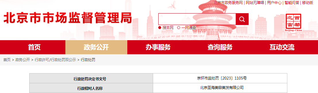 中国质量新闻网讯 近日,北京市市场监督管理局网站发布一条处罚信息,涉及北京圣海美容美发有限公司具体信息如下:行政处罚决定书文号京怀市监处罚〔2023〕1105号行政相对人名称北京圣海美容美发有限公司行政相对人类别