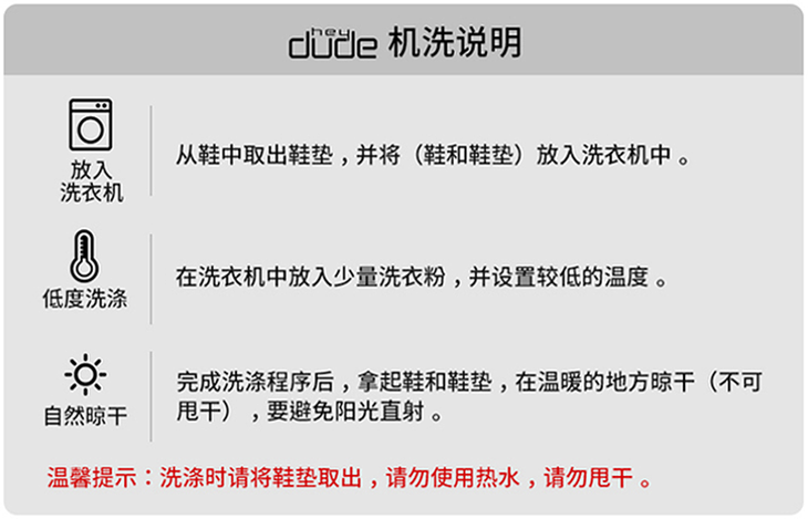 内里走线平整,直接光脚穿都很舒服就连我这个以前不穿袜子就难受的人,现在都爱上了光脚穿初次穿都不会磨脚!dude鞋还有一个无鞋能及的点——可机洗!免去手洗麻烦,堪称懒人福音(*也证明它家的鞋子设计真的牛)。