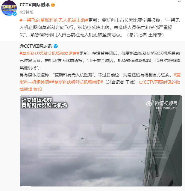 原标题:一架飞向莫斯科的无人机被击落一架飞向莫斯科的无人机被击落 莫斯科市市长索比亚宁通报称,“一架无人机企图向莫斯科方向飞行,被防空系统击落,未造成人员伤亡和其他严重损失”紧急情况部门人员已前往无人机残骸坠毁地点。