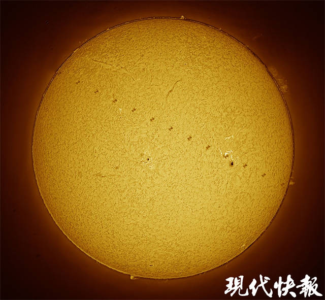“因为有了前两次的经验,我提早调试好设备,加上视宁度好,幸运地拍到了国际空间站凌日”说起此次拍摄的成功经验,陈自坚难掩兴奋,“加之我使用的滤镜不是巴德膜而是国外引进的一种滤镜,拍到的不是太阳光球层,而是清晰可见的太阳色球层。
