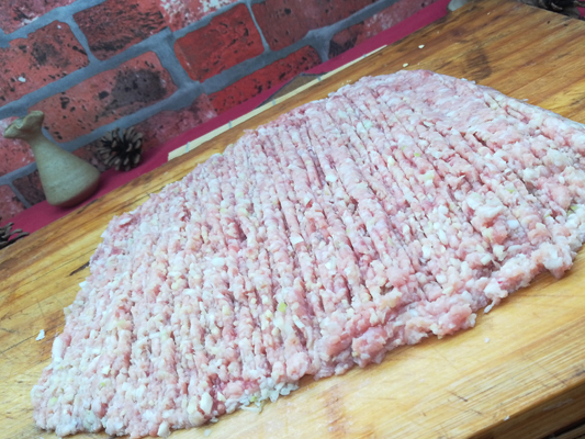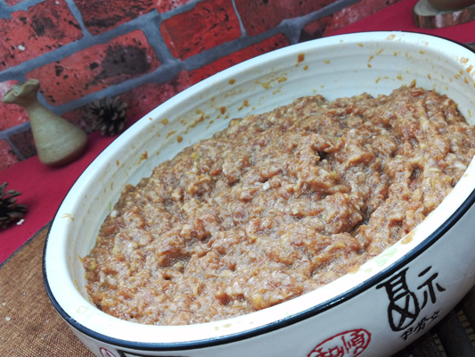 顺着一个方向搅肉上劲,配合着摔打肉馅,并少量多次打入花椒水150克搅至肉馅按上去,弹性十足,肉馅就搅好了把搅好的肉馅放入冰箱冷藏,搁置2小时左右,让各种味道充分融合,让肌肉纤维把水分充分吸收