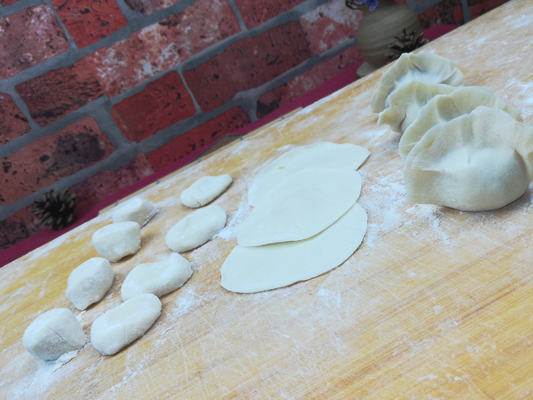 6、把醒好的面团再次揉匀,搓成长条状,揪出大小合适的面剂,擀成又薄又大的饺子皮,包入适量豆角肉馅,把口包齐、包严。