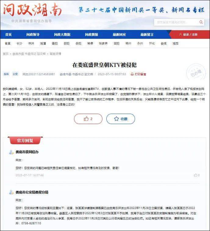 7月15日,这位女网民在“问政湖南”留言称,本人龚某辉,女,52岁,本地人2022年11月18日晚上,在娄底盛世皇朝KTV,我在醉酒人事不清的情况下被一男性在公共卫生间性侵犯,并被他人录了视频发在网上第二天11月19日,在朋友的提醒下,我知道自己被性侵犯了,下午就去乐坪派出所报案。