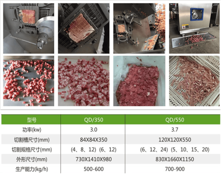 一次性成丝的肉丝肉片机、切软骨的鸡鸭带骨切丁机、熟肉切片机而且切丁的规格也都是需要根据客户的许需求来的,而且对于麻冻肉和鲜肉都是可以起到很好的加工效果的