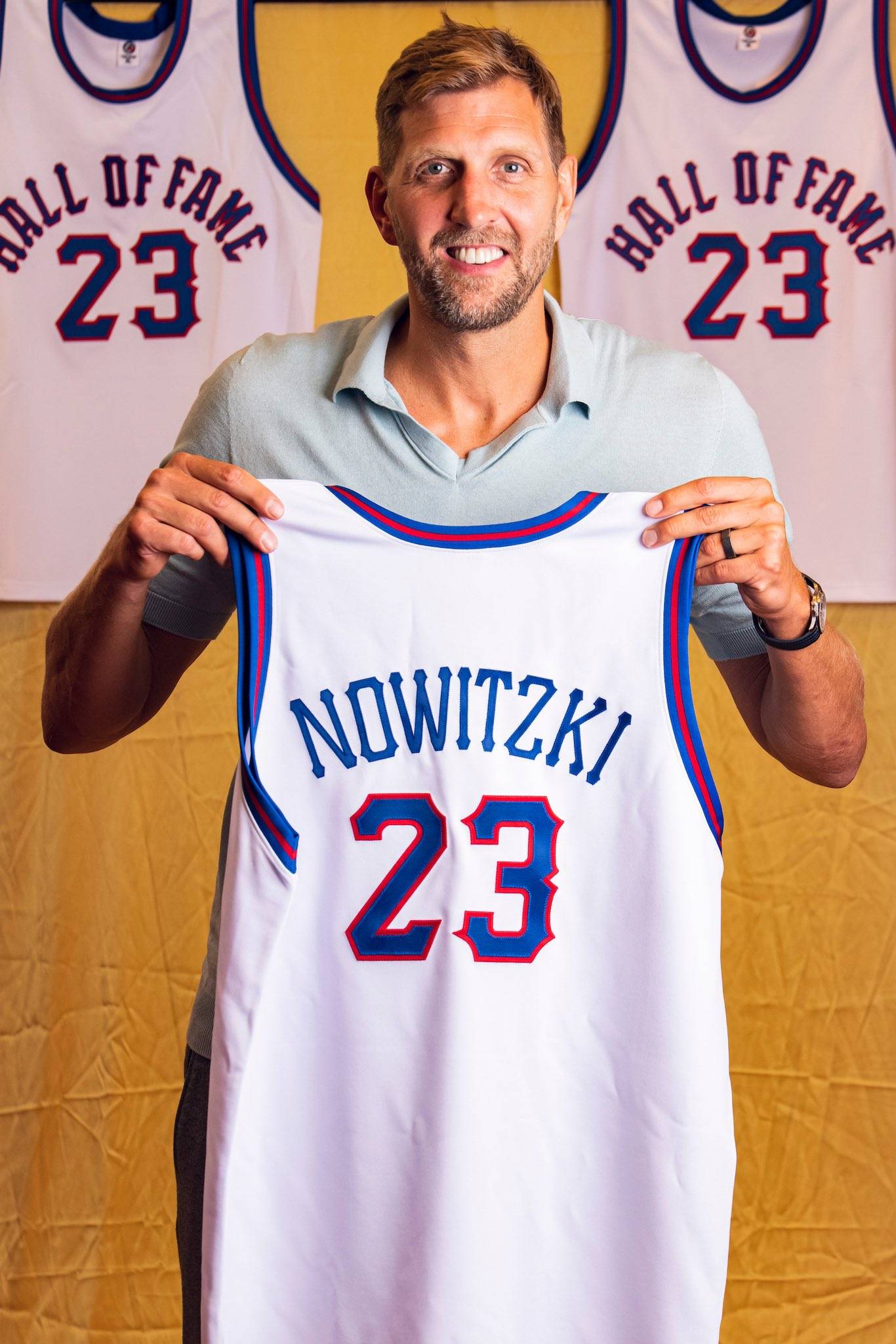 韦德、帕克、保罗-加索尔、诺维斯基和74岁的波波维奇都手持名人堂23号球衣拍摄定妆照,23号代表他们是2023年名人堂的成员。