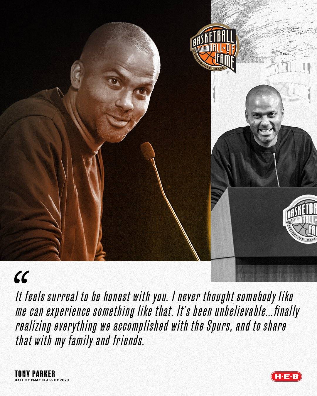 托尼-帕克成为第一位入选该名人堂的法国籍球员,在新闻发布会上,托尼-帕克笑着对波波维奇说:我无法摆脱他他必须和我一起入选名人堂吗?帕克还说他已经告诉波波维奇他需要享受这个周末,并开玩笑说他的演讲将比波波在比赛中的采访还要长。