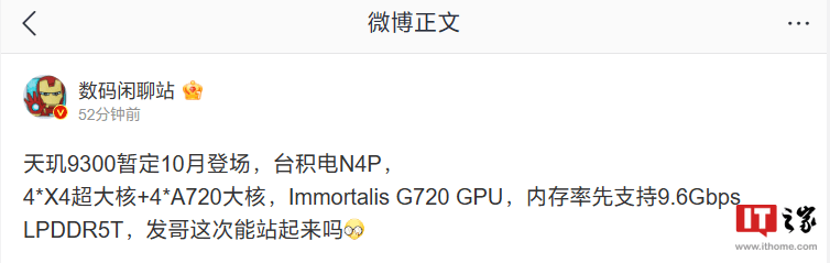 原标题:消息称联发科天玑 9300 处理器暂定今年 10 月登场IT之家 8 月 12 日消息,微博博主 @数码闲聊站 今日放出了一些天玑 9300 的爆料信息,其称这枚全新的处理器将暂定 10 月登场,基于台积电 N4P 制程打造。