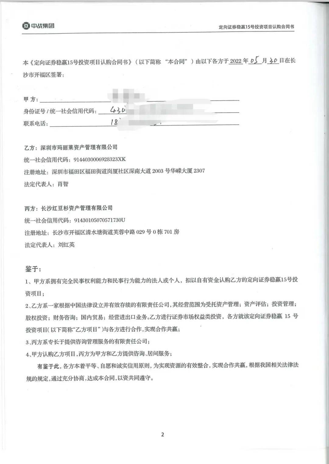 湖南投资者朱娟告诉澎湃新闻,2022年5月,她与深圳市玛丽莱资产管理有限公司和长沙红豆杉资产管理有限公司签订了三方合同,认购了“定向证券稳赢15号投资项目”,投资100万给乙方深圳玛丽莱用于证券市场权益类投资,2年到期,业绩比较基准为15.5%,约定到期总收益为31万元。