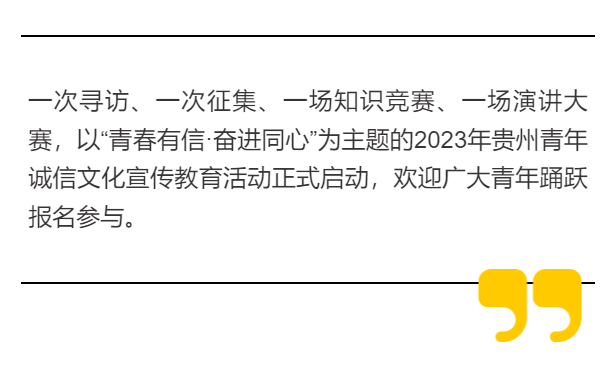 一次征集:以文字和图片记录诚信2023年贵州青年诚信文化宣传教育活动还将面向全省青年开展贵州省青年诚信作品征集大赛,征集诗歌和摄影作品诗歌作品以“诚实守信”为主题,摄影作品以“文明旅游”为主题,各设优秀作品奖20名,获奖作品将颁发证书及纪念奖章,并在移动端青年诚信宣传教育专题页面进行展播。