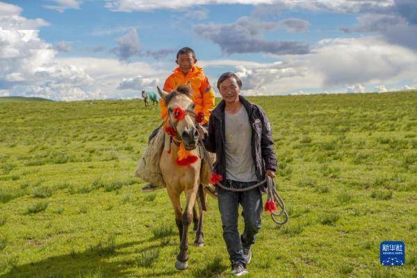列热觉旦骑着马,他的父亲次扎达牵着马行走在草原上(8月9日摄)西藏自治区那曲市,47岁的次扎达和他的马儿“隆达热巴”正在草原上奔跑“隆达热巴”,大意是“像风一样飞驰的马”次扎达养马已有20余年,视马匹为“宝贝”。