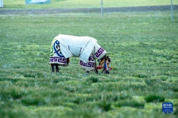 “隆达热巴”在雨中吃草,次扎达给它穿上了厚厚的“衣服”(8月9日摄)西藏自治区那曲市,47岁的次扎达和他的马儿“隆达热巴”正在草原上奔跑“隆达热巴”,大意是“像风一样飞驰的马”次扎达养马已有20余年,视马匹为“宝贝”。