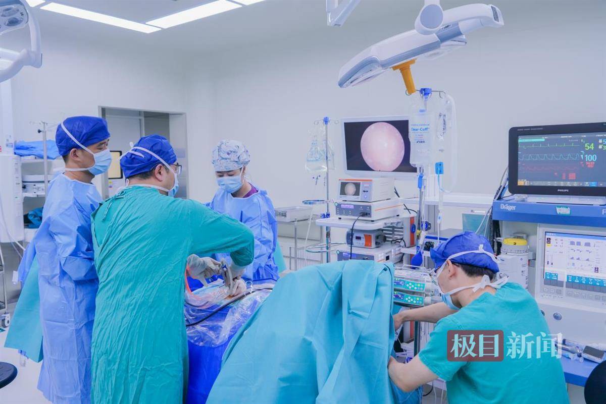 经过科学的综合评估,并与患者充分沟通后,泰康同济(武汉)医院骨科团队决定采取微创后入路腰椎管减压术通过精确定位,在患部皮肤上开一个不到1厘米的小口,通过光纤可视化设备投影到屏幕上,可视下通过后方入路到达目标区域,主刀医生在大通道内镜下逐层清除骨质、黄韧带,使用抓取器等器械将突出的髓核摘除,以减轻神经根压迫症状。
