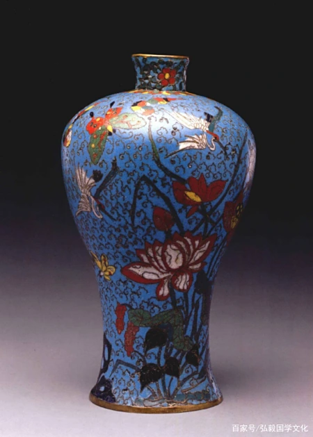 【掐丝珐琅池塘秋色图梅瓶】明晚期高27.5厘米口径10.5厘米梅瓶通体以天蓝色为地,挂丝勾云做锦地瓶通饰池塘秋色图景盛开的荷花和菊花随风摆动,伴有飞翔的仙鹤、蝴蝶等秋虫:下部为粼粼碧波和秀石颈部饰折枝梅花和莲瓣纹。