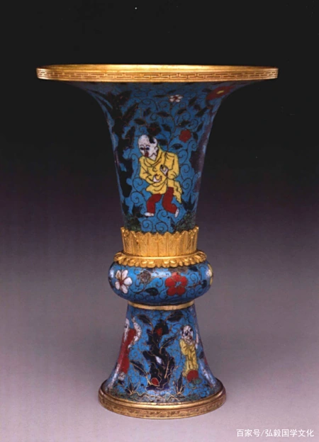 喇叭形口饰四朵缠枝莲花纹,足内镀金无款以人物作装饰题材在明代掐丝珐琅器中较为少见,故此器十分珍贵