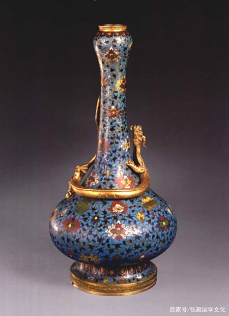 【掐丝珐琅莲托八宝纹蟠螭蒜头瓶】明晚期高13厘米口径3.7厘米足径11.3厘米瓶口为蒜头形,钢镀金蟠螭攀附于瓶颈通体以深蓝色珐琅釉为地,饰丝珐琅缠枝莲纹腹部饰缠枝莲花八朵,花上分别承轮、螺、伞、盖、花、瓶、鱼、结藏传佛教八宝纹。