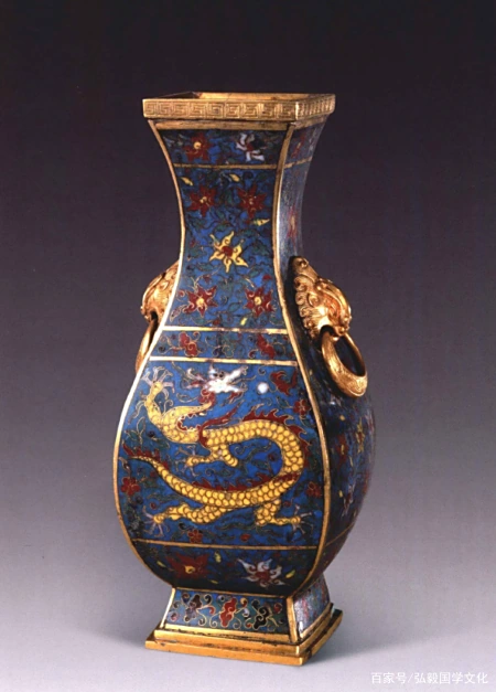 【掐丝珐琅龙戏珠纹方口瓶】明晚明高21.9厘米口径6.4厘米瓶颈部镶铜镀金狮首衔环双耳。通体以天蓝色珐琅釉为地,分层饰勾连花纹和灵芝纹。腹部正背两面梅花头衬底,黄色飞龙追逐颗白珠。足内镀金无款。