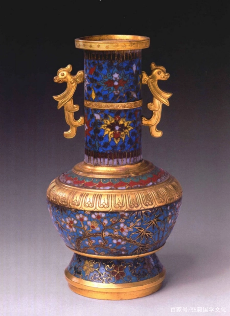 【掐丝珐琅梅竹纹螭耳瓶】明晚期高20.8厘米口径6.2厘米瓶颈两侧饰铜镀金双螭耳颈部以海蓝色釉为地,饰双层彩色维枝莲纹:肩部铜镀金錾莲瓣一周,腹部通饰绿竹与红白梅花主题图案,图足一周串枝梅花足内镀金,正中剔地阳文“大明宣德年製”楷书款。