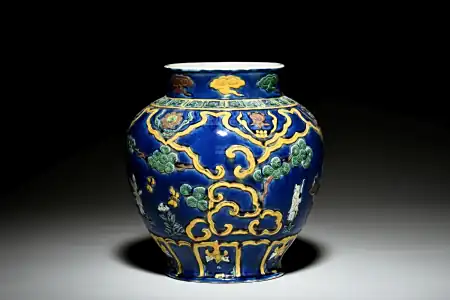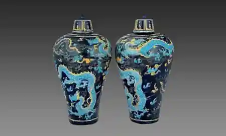 明清琉璃釉陶是指以陶土为胎,经高温素烧后表面涂刷铅釉,再经低温烧制而成的制品明清琉璃釉陶的釉仍是低温的三彩釉,用铅或硝作助熔刘,以铁、铜、钻、镒等金属元素为着色剂,不同的是琉璃再配以石英料,以增加釉层的厚度,釉色有黄、绿、紫、蓝、白、褐、黑、酱、棕、孔雀蓝、孔雀绿等。
