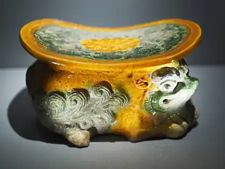 山西博物院所藏的一件明代黄绿琉璃釉陶莲蓬蹲狮香炉,是明代琉璃釉陶香炉中的代表作这件香炉造型为束颈,鼓腹,双耳稍外撇,兽首形三足香炉上覆荷叶莲蓬炉盖,束腰如蒂莲蓬上蹲狮张口吐舌,抓带戏耍,造型别致双耳上端刻有“呼延”铭文。
