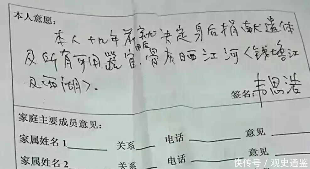 在众多的汇款凭证中,还有一张不起眼的白色纸条,这是是老人早年间瞒着家人,亲自签署的一份协议,大致意思是这样的,“本人自愿于死后滦县可用器官,骨灰撒江河。”