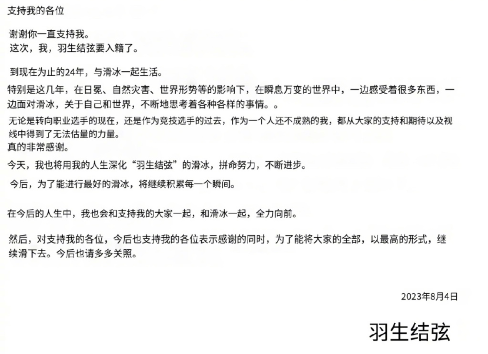 全文如下:支持我的各位谢谢一直以来的支持这次,我,羽生结弦要登记结婚了到目前为止,我与滑冰共同生活了24年特别是这几年,在新冠疫情、自然灾害、世界形势等的影响下,在瞬息万变的世界中,一边感受着很多东西,一边面对滑冰,关于自己和世界,不断地思考着各种各样的事情。